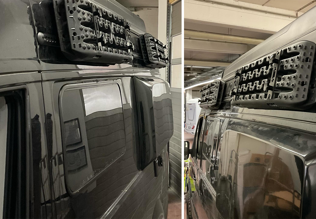 Auf dem Foto sieht man eine seitliche Montage im oberen Bereich: Die Boards sitzen in einer stabilen Halterung, sind eng am Fahrzeug geführt und wirken so, als wären sie genau für diese Position geplant worden. Das ist der Sweet Spot bei vielen Setups: gut erreichbar, sicher verstaut, wenig im Weg – und du verlierst keinen Stauraum innen.